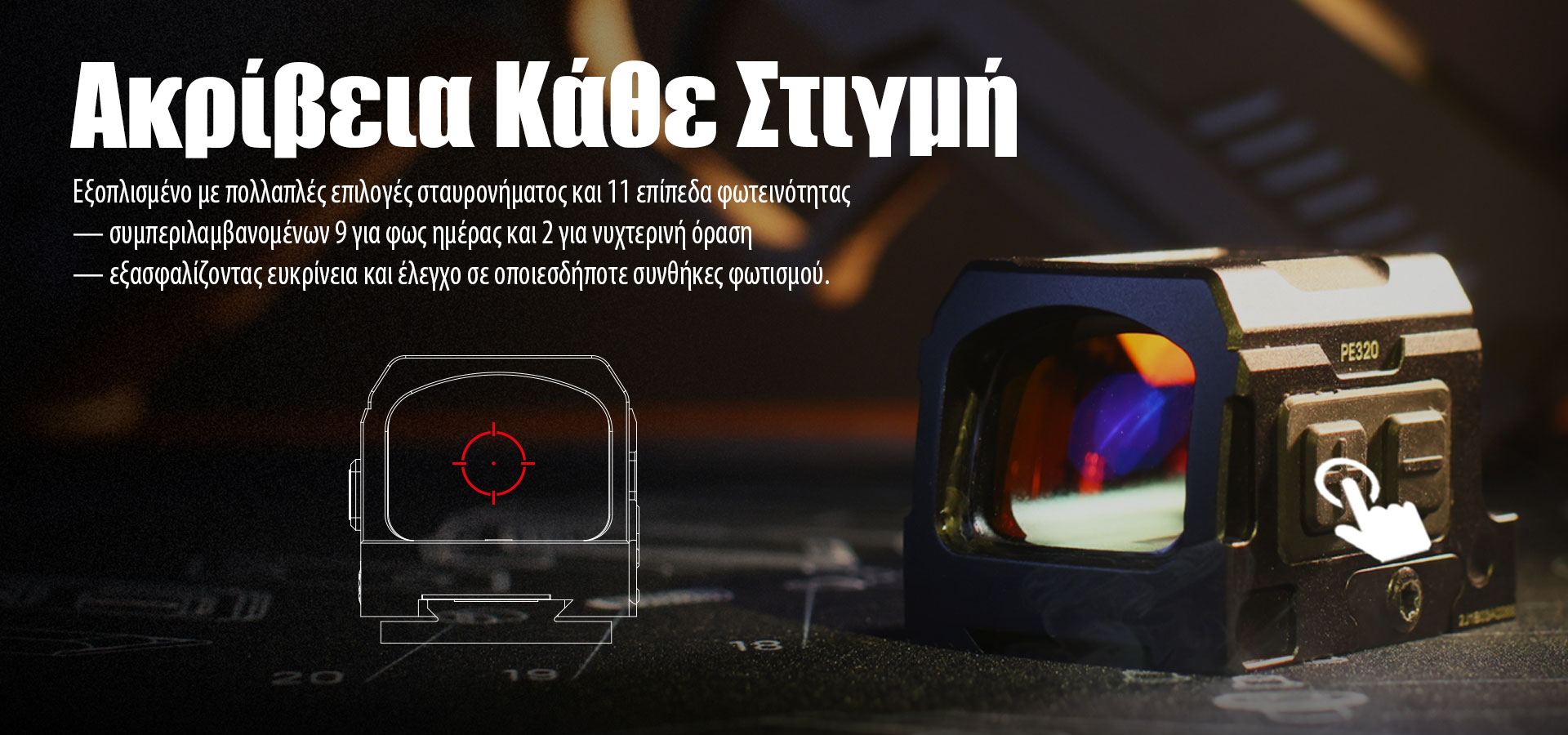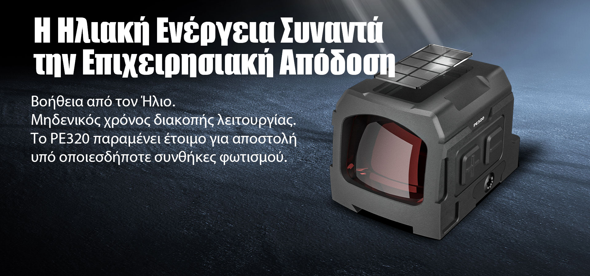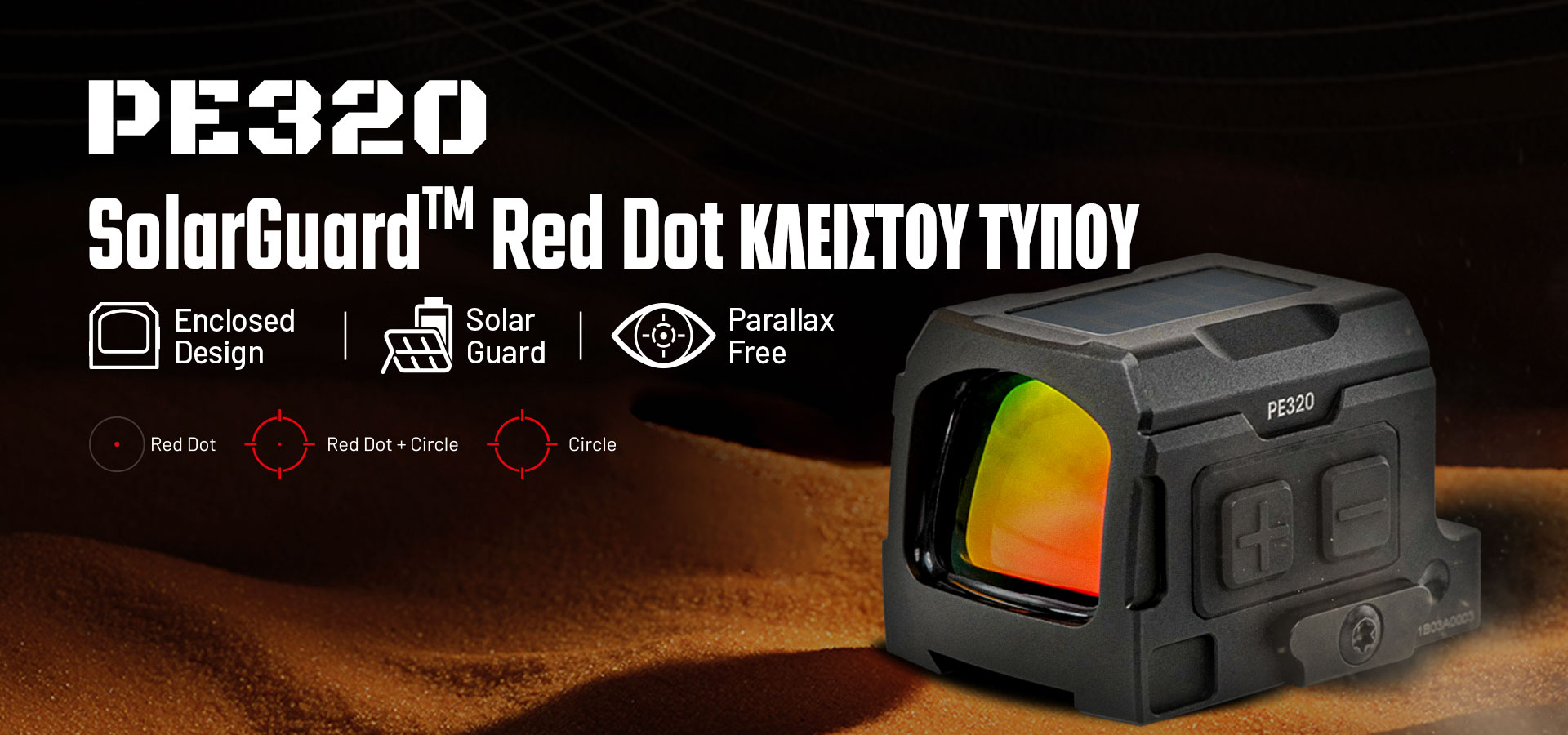Το κλειστού τύπου σκοπευτικό κόκκινης κουκκίδας PE320 σας προσφέρει την ταχύτητα, την αυτοπεποίθηση και την αξιοπιστία που χρειάζεστε όταν κάθε δευτερόλεπτο μετράει.