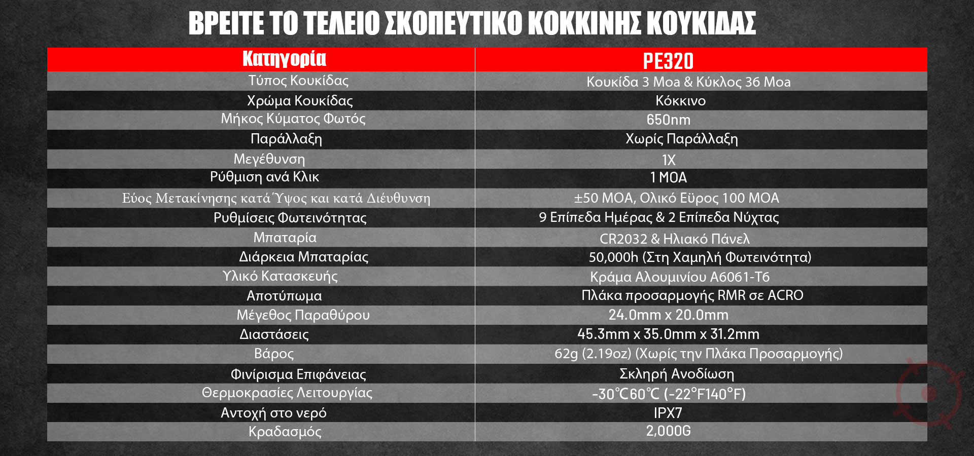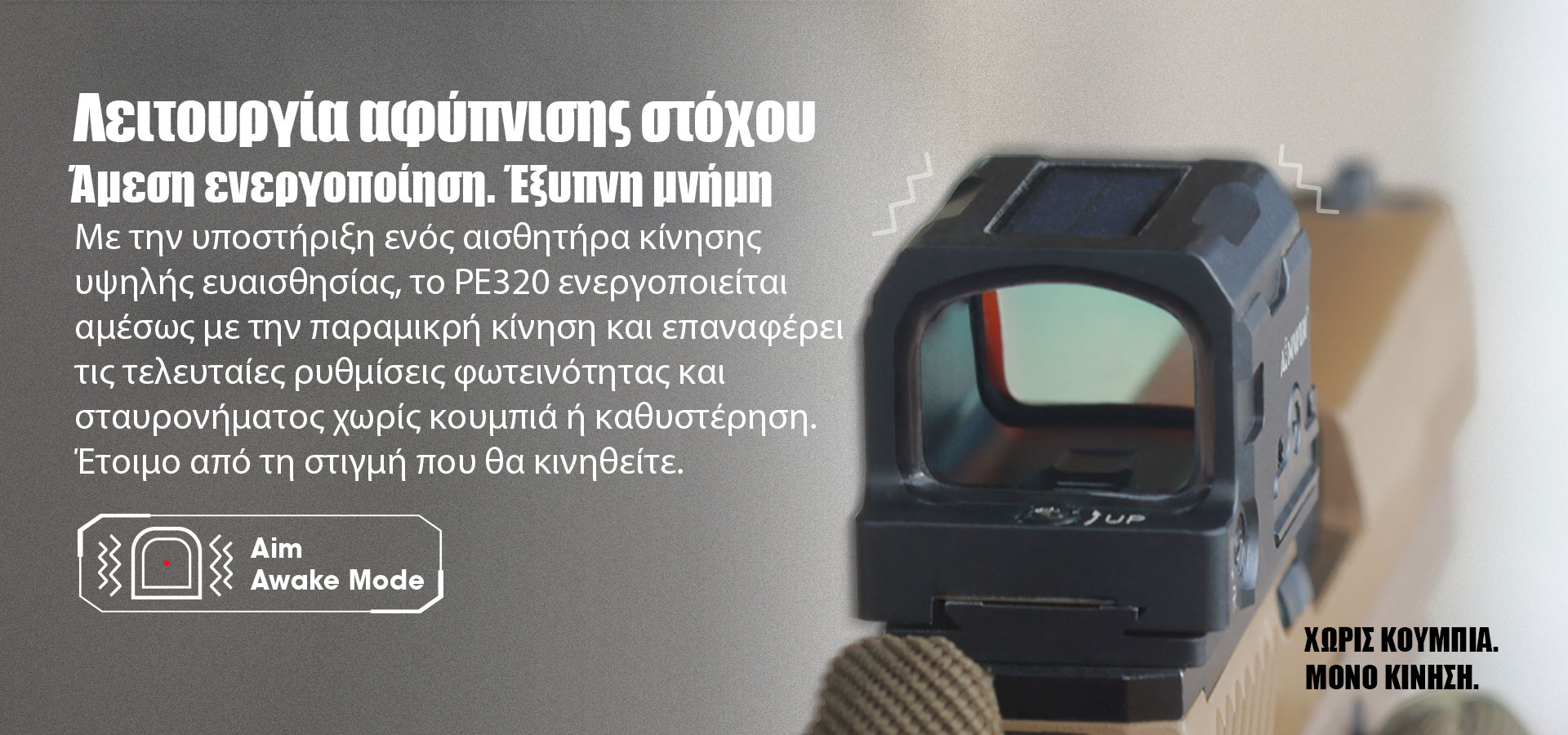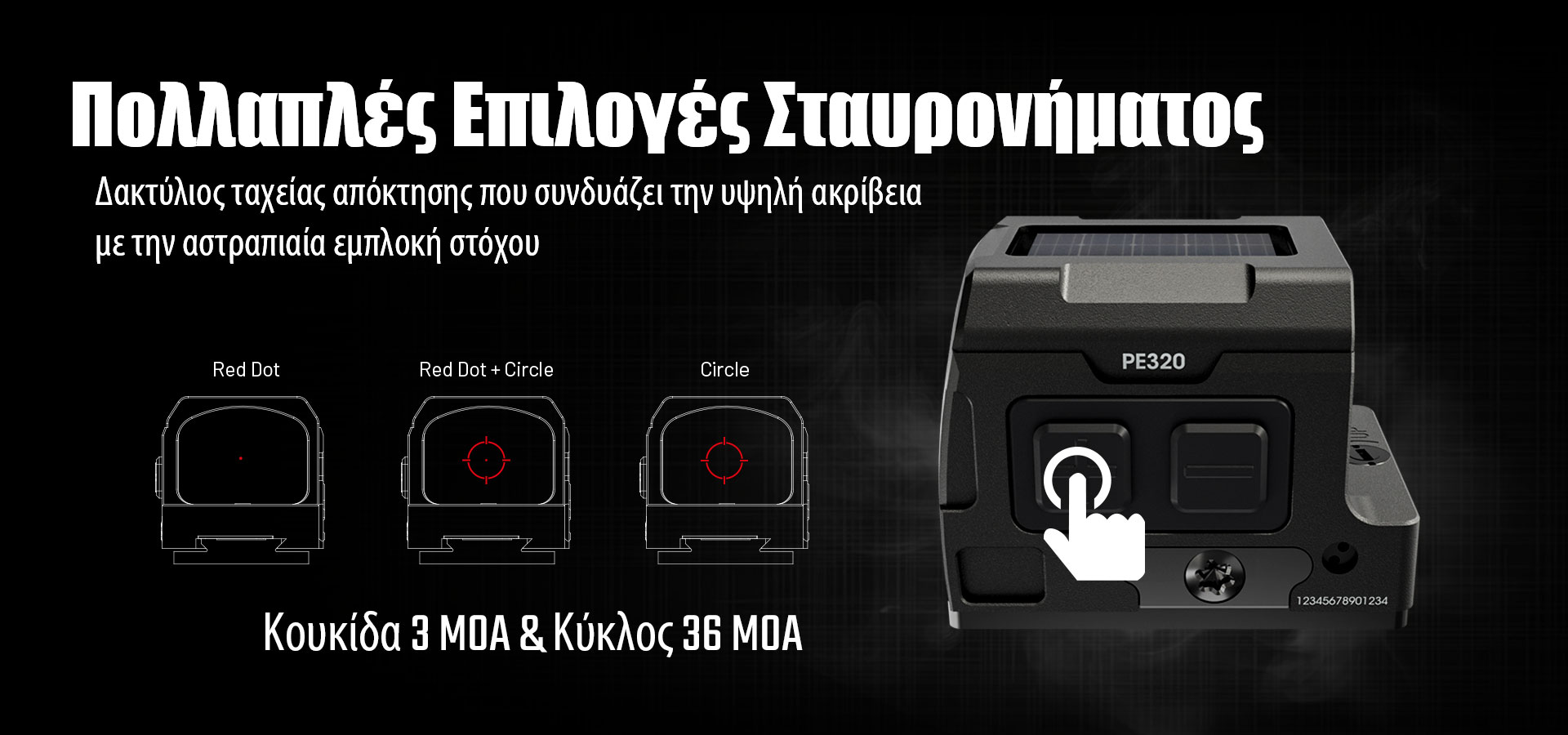 Το κλειστού τύπου σκοπευτικό κόκκινης κουκκίδας PE320 σας προσφέρει την ταχύτητα, την αυτοπεποίθηση και την αξιοπιστία που χρειάζεστε όταν κάθε δευτερόλεπτο μετράει.