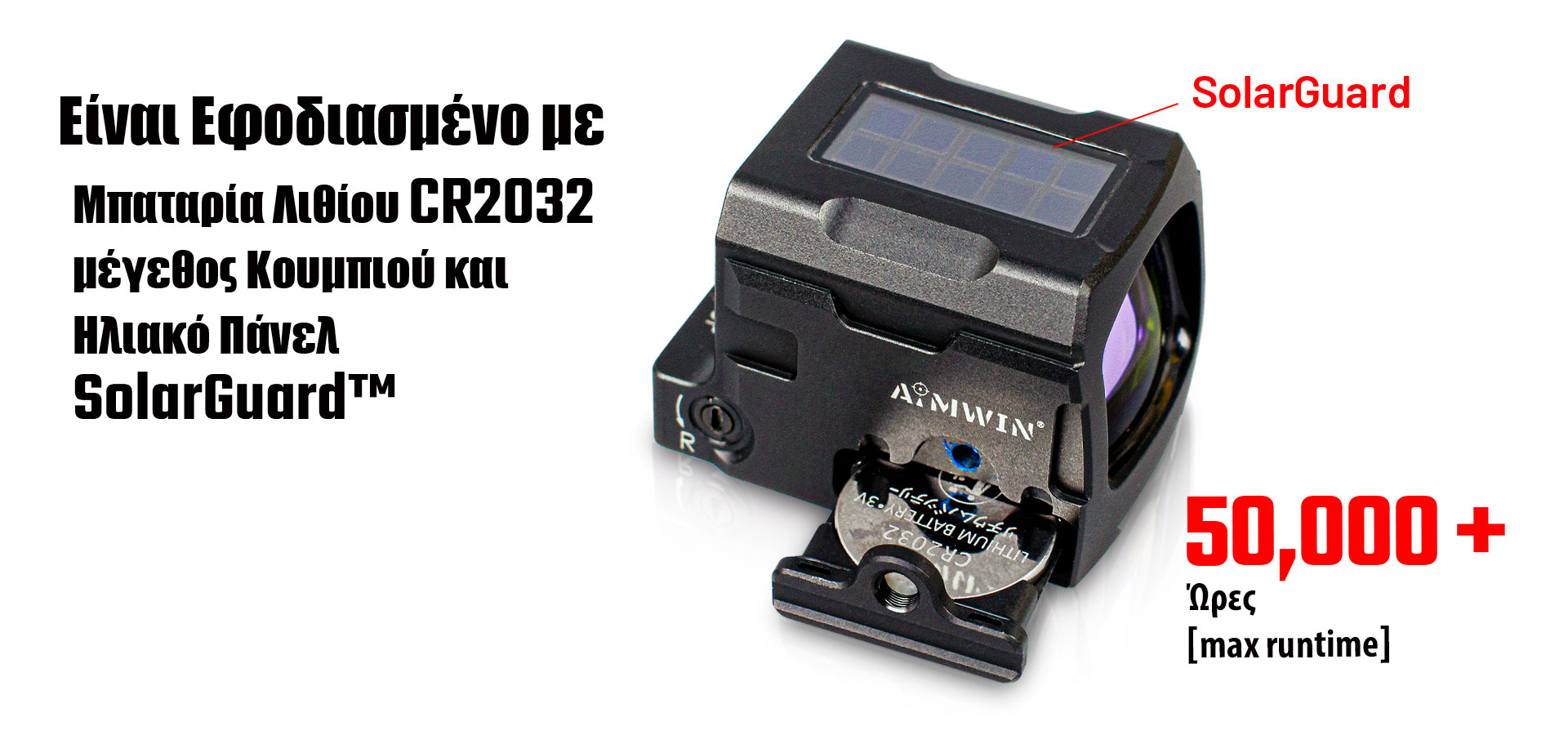 Τροφοδοτείται από μια μπαταρία CR2032 με ηλιακή υποστήριξη, το σύστημα λειτουργεί έως και 50.000 ώρες στις χαμηλότερες ρυθμίσεις, μειώνοντας την εξάντληση και διατηρώντας το οπτικό σας σύστημα ενεργό ακόμα και αν η μπαταρία πεθάνει.