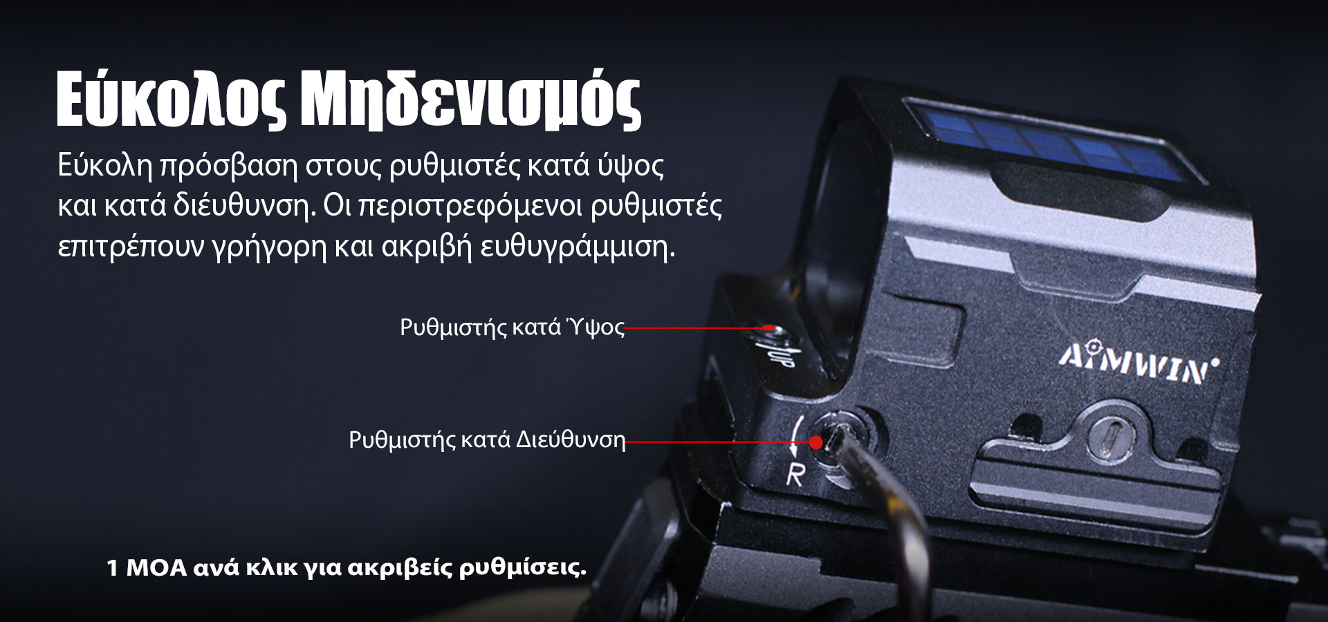 Εναλλαγή μεταξύ κουκκίδας 3 MOA και δακτυλίου 36 MOA με τρεις λειτουργίες σταυρονήματος για μεγάλη ακρίβεια, γρήγορη απόκτηση στόχου ή διαισθητικό οπτικό έλεγχο, με ρύθμιση 100 MOA (1 MOA ανά κλικ) για γρήγορο μηδενισμό και προσαρμογή σε οποιαδήποτε πλατφόρμα.