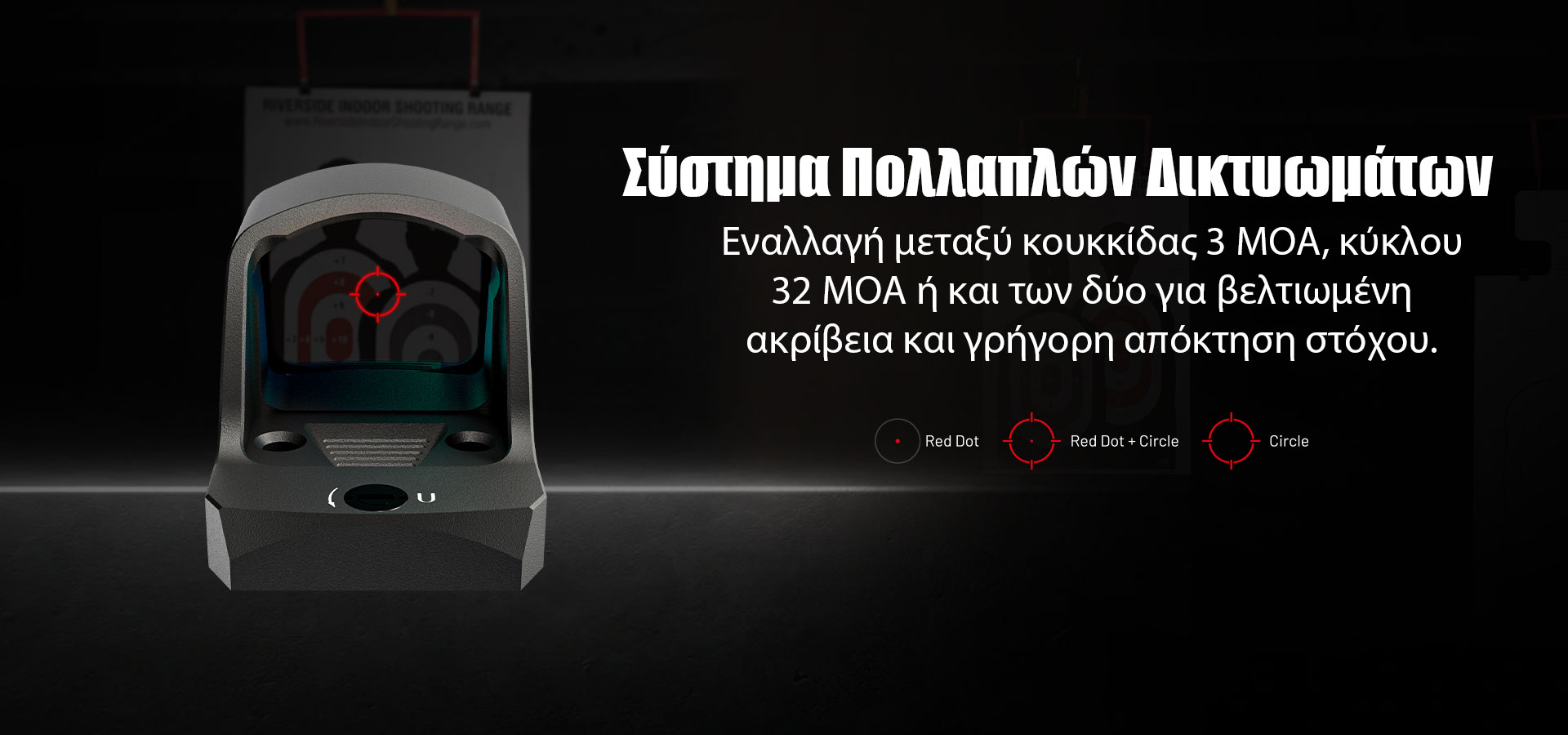 Πολλαπλά Σταυρονήματα: Διαθέτει σταυρονήματα κουκίδα 2 MOA , κύκλο 32 MOA και συνδυασμό αυτών για γρήγορη ανίχνευση στόχου.