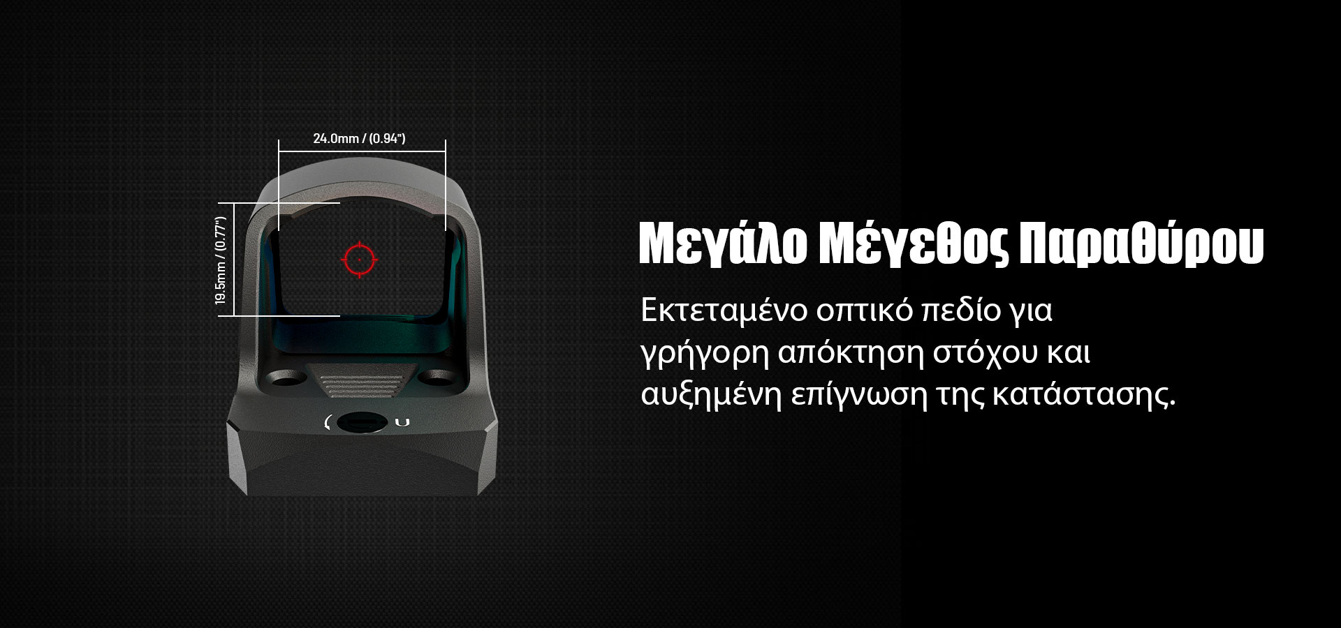Το παράθυρο των 24 mm προσφέρει μεγάλη οπτική γωνία, ενώ ο σχεδιασμός ανοιχτού αντανακλαστικού διατηρεί την επίγνωση της κατάστασης.