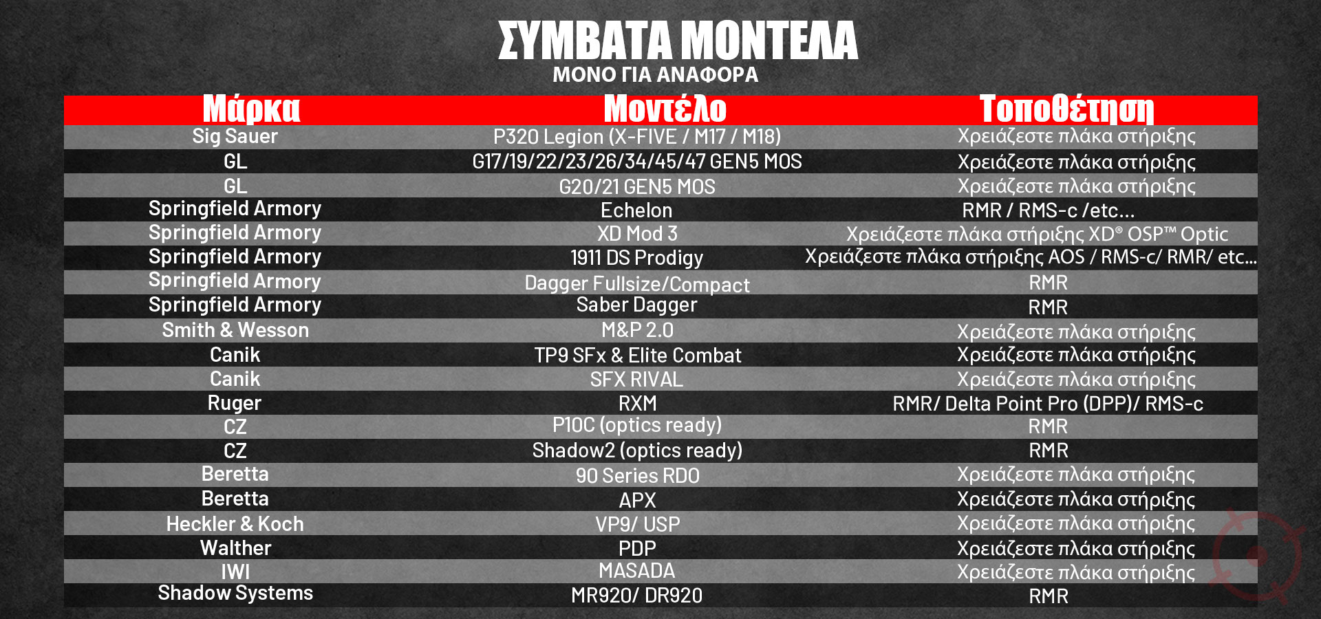 Συμβατότητα με αποτύπωμα RMR: Ταιριάζει στα περισσότερα πιστόλια που δέχονται οπτικά συστήματα και έχουν κλείστρο RMR,